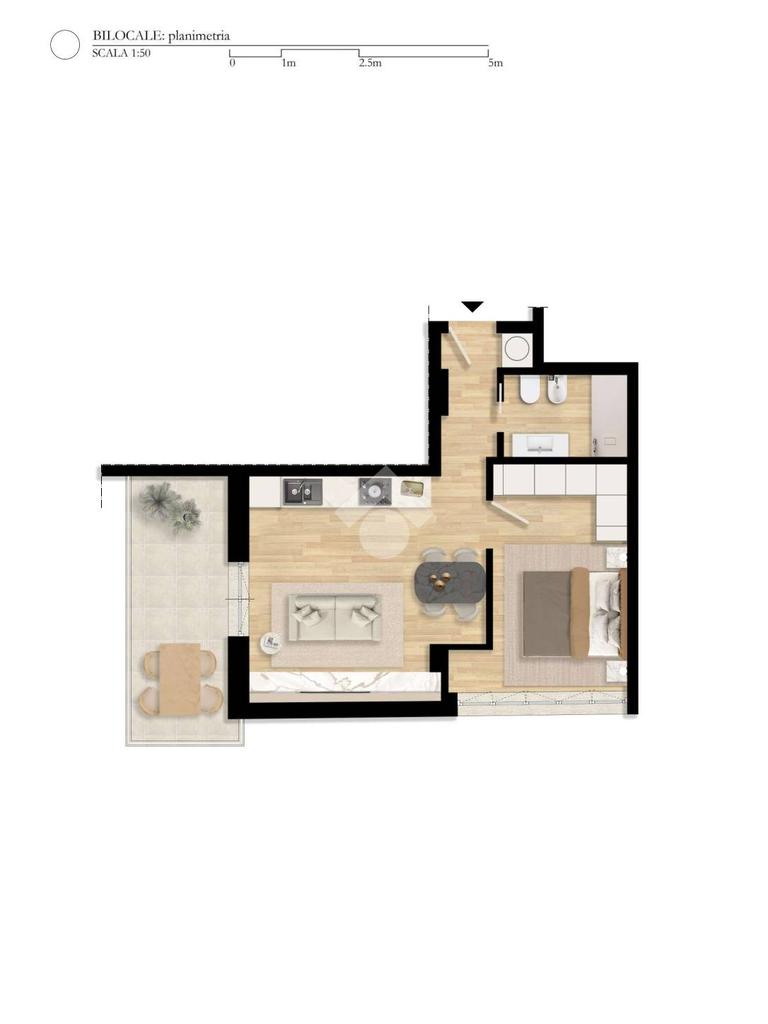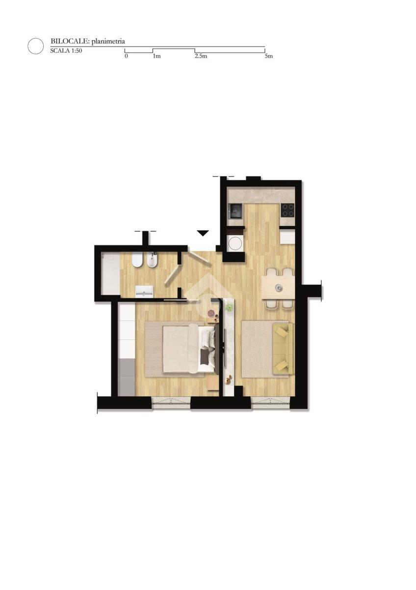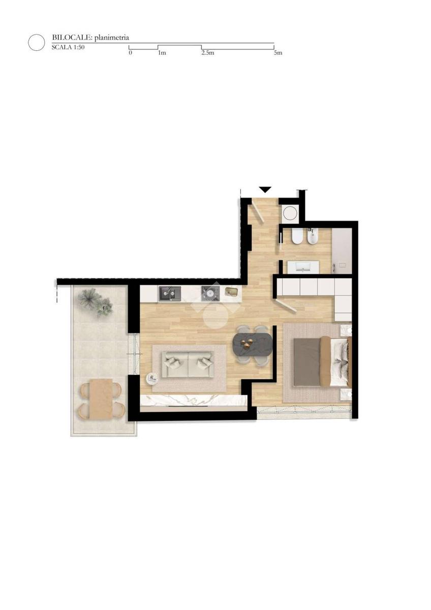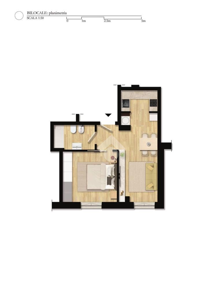Salone con angolo cottura, camera da letto matrimoniale e bagno, quest'ultimo completamente arredato, l'immobile si presenta con finiture di pregio quali, pavimentazione in parquet rovere, infissi doppio vetro PVC da 2 cm con gas termico, predisposizione condizionatori in tutti gli ambienti, porta blindata, piatto doccia walk-in da 150 cm.