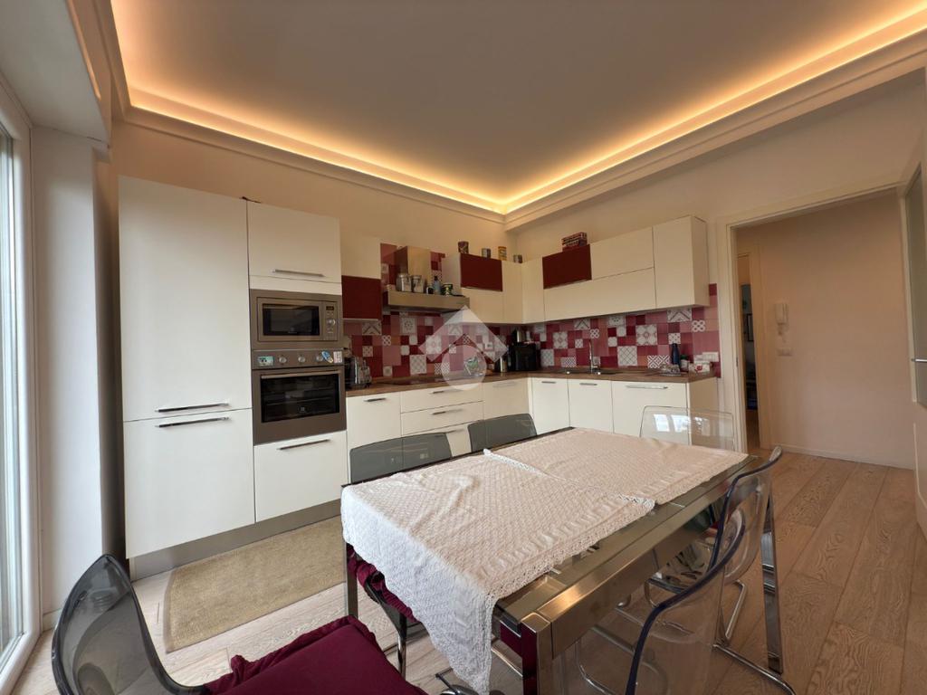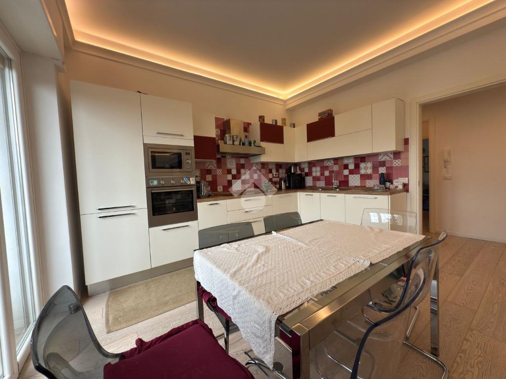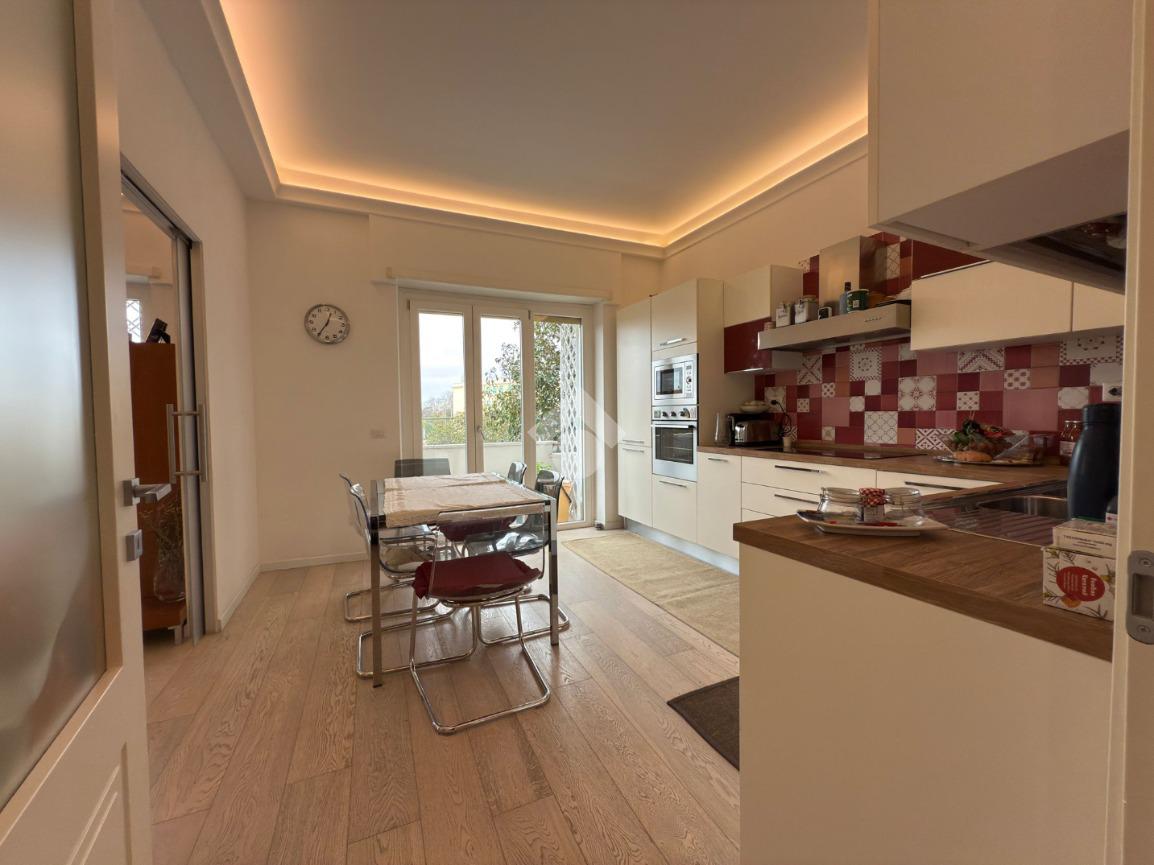 La cucina abitabile, funzionale e ben organizzata, è collegata al salone tramite un’elegante porta a vetri, soluzione che garantisce continuità visiva e luminosità mantenendo al tempo stesso la separazione degli ambienti.